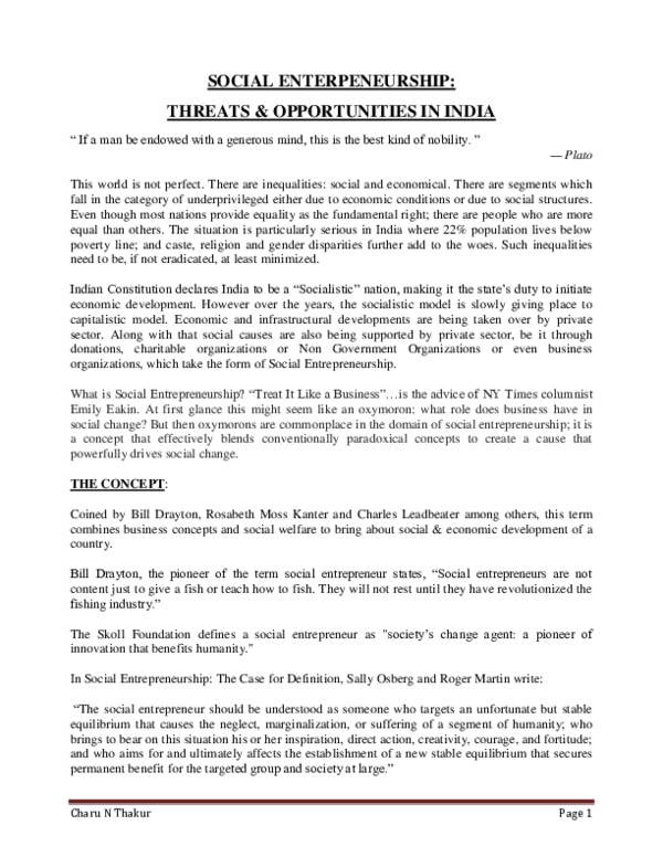 Pdf Social Enterpeneurship Threats And Opporutnities In India Charu N Thakur Academia Edu