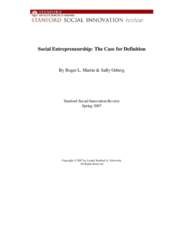 Social Entrepreneurship The Case For Definition Stanford Social Innovation Review Leadership Social Entrepreneurship The Case For Definition Social Course Hero