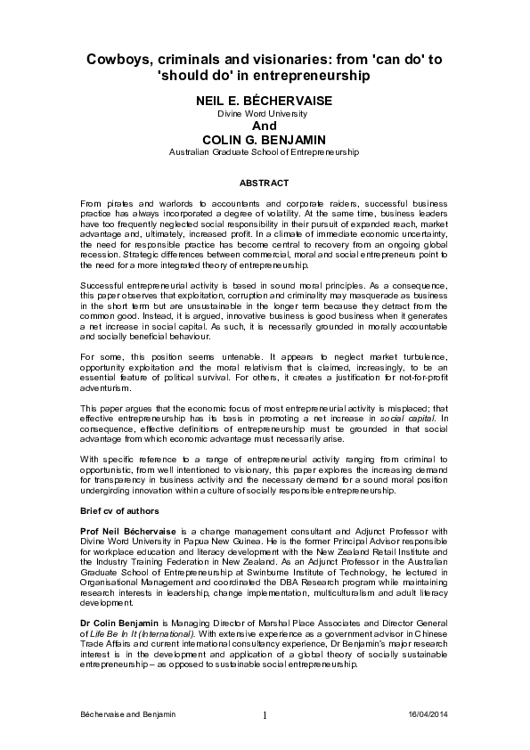 Cowboys Criminals And Visionaries From Can Do To Should Do In Entrepreneurship Neil Bechervaise Academia Edu