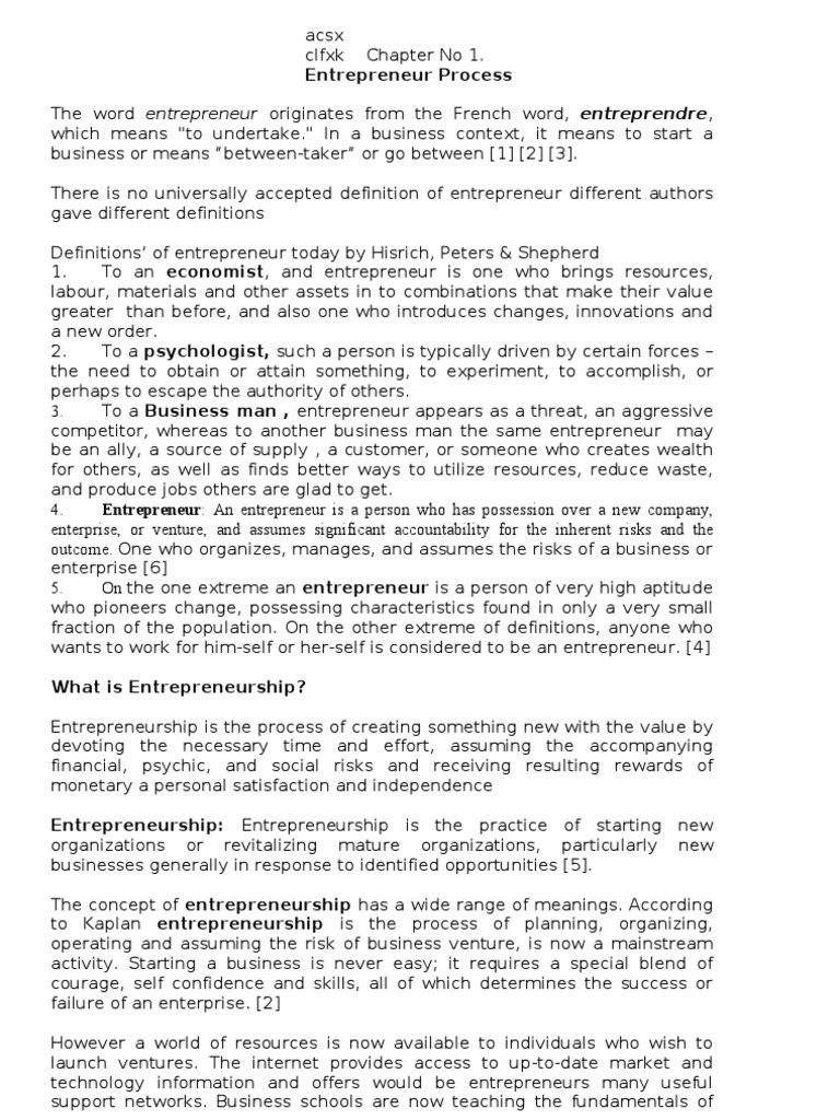 Entrepreneur definition by different authors. The word entrepreneur is derived from the french word entreprendre which means to undertake ie individuals who undertake the risk of new enterprise. Entrepreneurship is a concept that is so protean in nature that it is virtually difficult to categorize it in a single accepted definition. The word entrepreneur therefore first appeared the french language in the beginning of the sixteenth century.