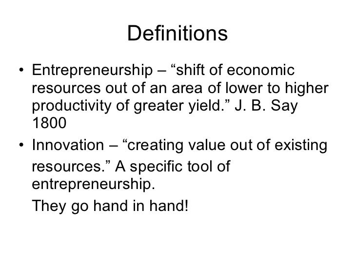 This defines entrepreneur and entrepreneurship the entrepreneur always searches for change responds to it and exploits it as an opportunity. The entrepreneur wrote frenchman j b say in 1800 shifts economic resources out of an area of lower and into an area of higher productivity and greater yield this was the original definition and the best drucker maintains. I suppose it depends on ones definition of an entrepreneur.