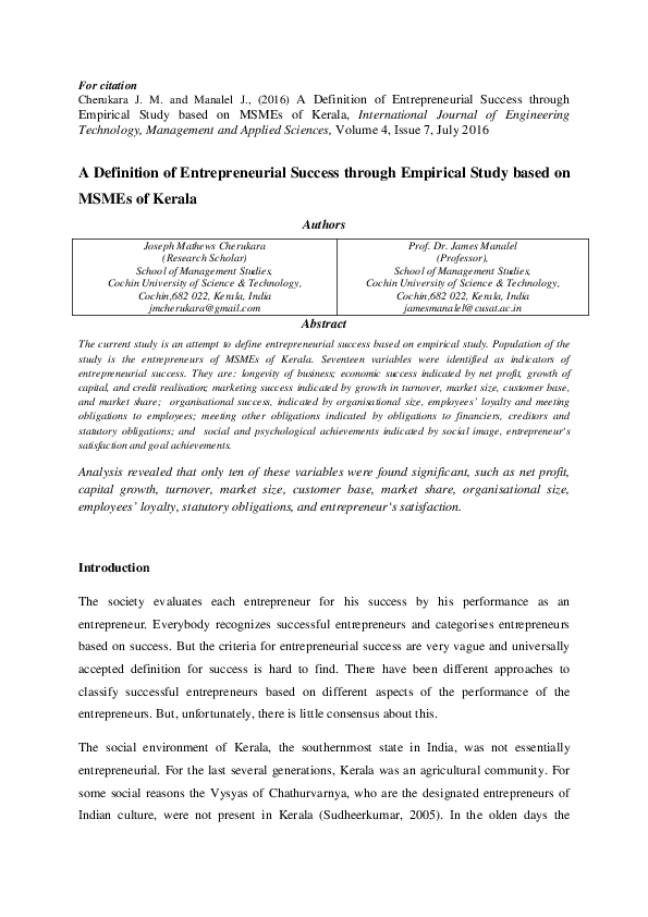 Pdf A Definition Of Entrepreneurial Success Through Empirical Study Based On Msmes Of Kerala Joseph Cherukara Academia Edu
